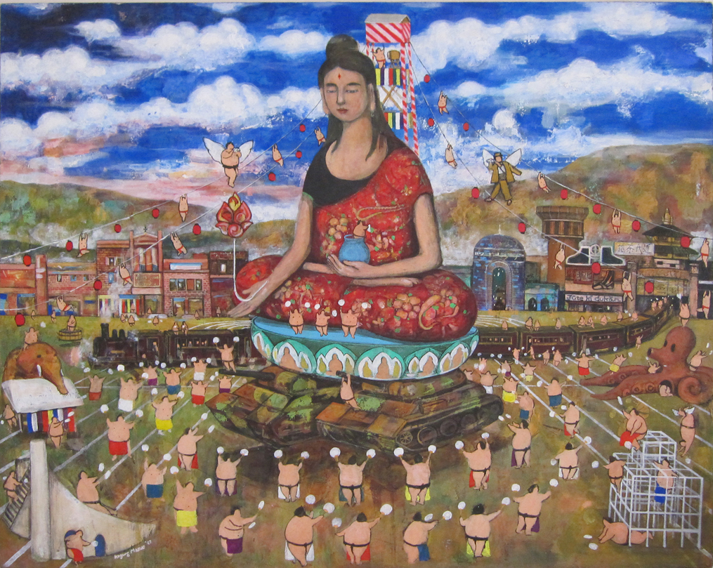 汗が吹き出るのを覚悟で、右腕に小品の数々。左腕に50号キャンバスに描かれた「ウランバーナの薬師」を持っていざ出陣。