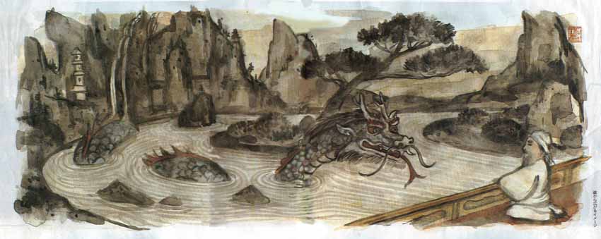そして、すぐに庭は再び動きはじめ、今度は別のイメージへと変化する。そそり立つ枯れ滝から瀑水がしぶきをあげ、峡谷を流れ落ち、大河から大海へと旅を続ける。またしばらくすると、庭は動くのを止めて、元の石組みへと戻っていくのだ。