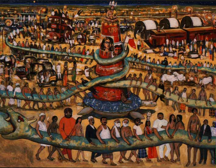 ヴィシュヌ自身も巨大なカメに変身し、攪拌の軸になると、不思議や不思議。