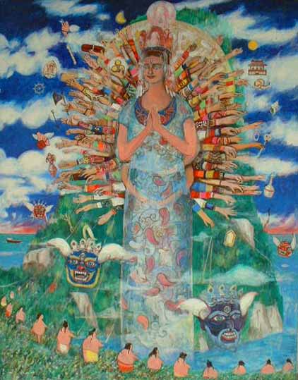 飛鳥時代のヘア−スタイルをした力士たちが、観音さまを讃えています。